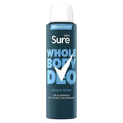 Keep fresh all over with Sure's Whole Body Deodorant. 72 hours of whole body odour control so you can overcome your limits. This deodorant is suitable for the whole body; it features our unique Body Adapt Technology, which stops odour before it starts. It's simple to apply. Hold the deodorant spray 15 cm from your skin and spray where you want to fight odour. Avoid face. To avoid stinging, do not apply to freshly shaved skin. Sure's whole body deodorant for men features a herbal, woody scent with a dynamic and clean feel. Stay fresh all over with this odour control deodorant. Use it anywhere you want to tackle odour, including your pits, privates, feet and beyond.