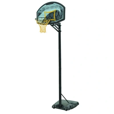 A strong high adjustable portable basketball system Durable polypropylene backboard 18" solid steel powder coated ring with net 24" adjustable arm for height alteration Heavy duty pole made up of 3 links of 3.5" diameter Sturdy base requiring 190 kg of dry sand or water for ballast Rolls on 2 wheels for easy movement Ground stake included Approved by England Basketball, Basketball Scotland and Basketball Ireland