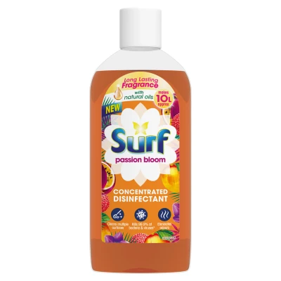 Surf Passion Bloom Concentrated Disinfectant has a long lasting passion fruit, mango & lychee fragrance Our concentrated surface cleaner features a powerful formula containing natural oil This concentrated disinfectant makes approximately 10 litres (only use diluted) This multi-purpose cleaner is perfect for cleaning almost any surface around your home Our all-purpose cleaner eliminates 99.9% of germs while leaving surfaces fresh and clean With a powerful cleaning formula, this liquid disinfectant eliminates tough odours