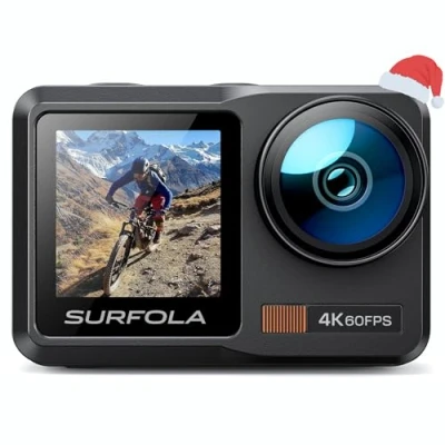 Surfola SF630 Action Cam 4K 60FPS, Underwater Camera 40 m Bare Metal Waterproof 10 m, WiFi, Ice Helmet Camera, Dual Screen with External Microphone, 2 x 1350 mAh Batteries and battery dock