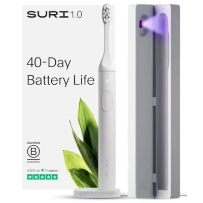 WHITER TEETH AFTER JUST ONE USE - Designed & tested by Dentists. Our SURI toothbrush is clinically tested to remove 300% more plaque than a manual toothbrush. Electric is the way to go for those looking for healthier teeth and less sensitive gums UV-CLEANING TRAVEL CASE - SURI includes a slim travel case that uses UV-C technology to clean your tooth brush head in just 1 minute. It also charges your brush when plugged in. At last—a travel electric toothbrush you'll love RECYCLABLE PLANT-BASED HEADS and BRISTLES - SURI's eco-conscious electric toothbrush uses brush heads made of renewable cornstarch, and medium-soft bristles made from castor oil. SURI also offers a simple and FREE recycling service in the US DURABLE ALUMINUM BODY—BUILT TO LAST - Light, sleek and IPX7 waterproof. Available in five colors. Always wanted a pink electric toothbrush? You’re in luck. SURI's brush has a 2-minute timer and two powerful brushing modes for deep cleaning LONG 40+ DAY BATTERY LIFE - Imagine only needing to charge your toothbrush once a month. Our rechargeable toothbrush for adults lasts over 40 days and recharges in just 4 hours via USB. A dependable electric toothbrush—battery powered and ready to go