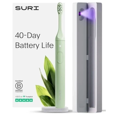 SURI Electric Toothbrush—Sustainable Toothbrushes Adults. Slim Sonic Toothbrush & Accessories. 40 Day Battery, 2 Modes. Travel Toothbrush. Ideal Christmas Gifts for Women Men