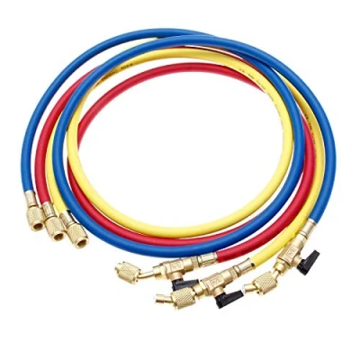 APPLICATION ----- R134a charging hose with compact ball valve deigned to meet 1/4" SAE requirement for refrigerant permutation, fit most refrigerants like R134A, R22, R12, R502, R404. Standard 1/4” female flare fittings with a valve core depressor and 45°bend on one end for convenient access to the system. HIGH WORKING PRESSURE ----- Working Pressure: 800 PSI; Burst Pressure: 4000 PSI. Hose and ball valves with 1/4" SAE thread can be fitted most refrigerants. Note: R410 and R32 refrigerants with 1/4" SAE x 5/16" SAE, if you want to use it on R410 and R32 refrigerants please use a M-1/4" SAE x F-5/16" SAE Adapter. EASY INSTALLATION ----- 3 colors 60” (5ft) refrigerant lines coded in red, blue and yellow, and all completed with compact ball valve and plastic handles on each hose. The coupler nuts are deeply knurled for quick finger-tightening. PREMIUM QUALITY ----- Refrigerant 3-color charging hoses made of high-quality brass alloy and rubber, last long; easy to operate and install, strong sealing for durability and safety. Necessary tools for HVAC, car air condition maintenance and coolant or Freon adding. SERVICE ----- Please feel free to contact us if you have any question about these 3 color refrigerant charging hoses., Manufacturer: Surieen