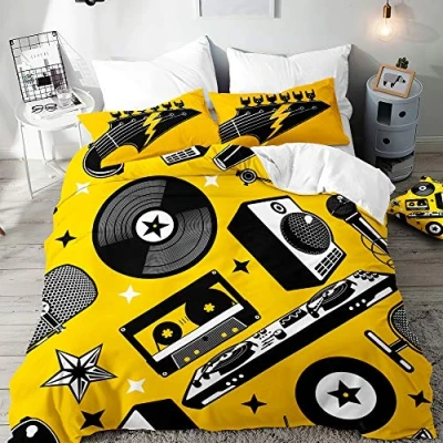Surwin Bedding Set Microfiber 3pcs for Double Single Size, 3D Guitar Duvet Cover with Music Printing Quilt & 2 Pillowcases King Super Adult Kids (Vinyl record,Double 200x200cm)