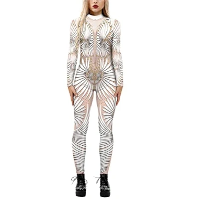 Surwin Halloween Women's Creative Funny Catsuit Outfits Ladies 3D Printed Long Sleeve Skinny Stretch Fancy Dress Up Cosplay Adults Jumpsuit Bodysuit (Mummy Style,L)