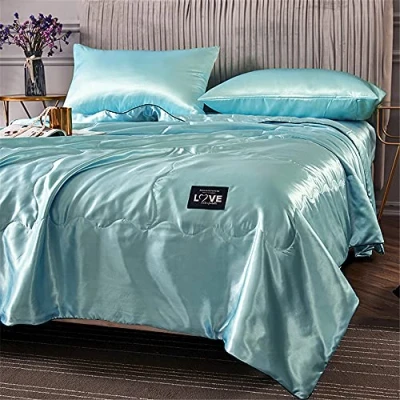 Surwin Luxury Quilted Bedspread, Silky Washed Silk Fabric Coverlets Quilt, Plain Single Double King Size Lightweight Easy Care Throws Blanket Patchwork Bed Sheet (Light Blue,200x230cm)