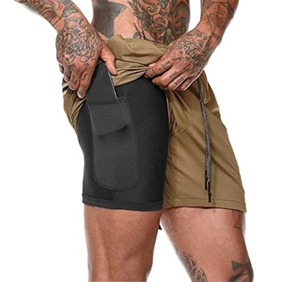 Surwin Men's Quick Dry Swim Trunks Swimming Shorts with Compression Liner 2 in 1, Summer Beach Pants Casual Running Gym Sports Boardshorts Pockets Brown