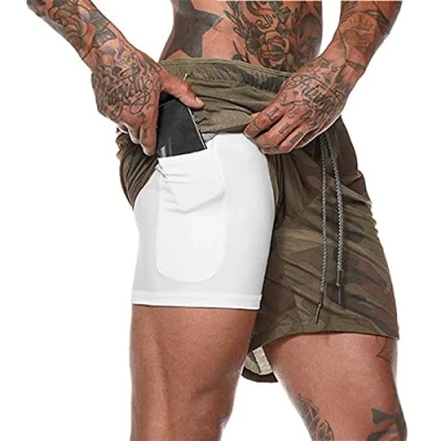Surwin Men's Quick Dry Swim Trunks Swimming Shorts with Compression Liner 2 in 1, Summer Beach Pants Casual Running Gym Sports Boardshorts Pockets Camouflage