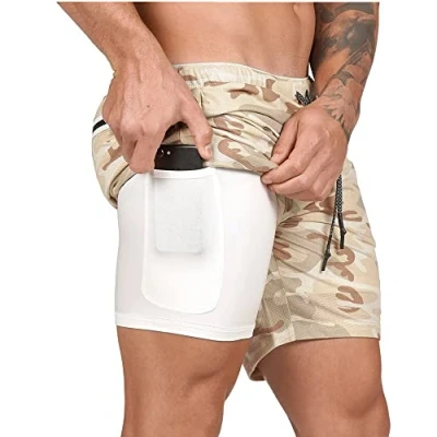 Surwin Men's Quick Dry Swim Trunks Swimming Shorts with Compression Liner 2 in 1, Summer Beach Pants Casual Running Gym Sports Boardshorts Pockets Khaki