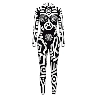 Surwin Women's Catsuit Halloween Costume, 3D black & White Abstract Printed Long Sleeve Skinny Stretch Onesies Ladies Jumpsuit Cosplay Adults Fancy Dress Up