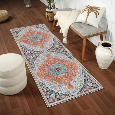 Hallway runner rug collection featuring classic, traditional patterned and bohemian rug designs in a shabby chic oriental style, multicoloured rug combinations of Fuchsia, Orange, Saffron, Dark Blue, Aqua, Cream colours Strong and durable soft area rugs in a range of small, medium, large, extra large, round rugs and runner rug sizes, machine woven in polypropylene, with a virtually non-shedding 8 thick pile; durable, moisture, bleach and stain resistant Designed to withstand everyday wear; this colourful and hard wearing rug is child approved and pet friendly. Oeko-Tex standard 100 certified; free of any harmful substances and hypoallergenic Easy care pile cleaning; for long lasting coloured lounge rugs vacuum regularly and blot up small floor rug stains with a mild detergent or carpet cleaner Perfect area rugs for living room and other high traffic rooms in your home; lounge, dining room, kitchen runner, corridor, office, bedroom, playroom and hallways