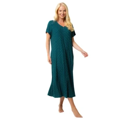 This is one of our most popular nighties and we think it's a must-have for anyone who prefers a nightdress . Many customers return to purchase a second or third colour when they enjoy their first nights sleep. The attractive charcoal polka dot design offers a classic, yet timeless look in Classic Navy, Burgundy or Forest options, Pretty Pastels and stylish florals are also a stylish addition to this range. A generous 48in/123 cm length, V-neck with 3 button fastening and sizing available up to size 30/32 offer the ultimate in comfort and convenience. Experience luxurious softness and superior comfort, guaranteed! Premium 95% Polyester, 5% Elastane Supersoft fabric SOFT JERSEY FABRIC: Made from premium, soft, and breathable jersey fabric, this nightgown provides exceptional comfort, perfect for a restful night’s sleep. STYLISH DESIGNS: Available in a selection of attractive patterns, this nightgown ensures you look stylish, even while lounging or sleeping. SHORT SLEEVES AND V NECK: Featuring short sleeves and an elegant V-neckline with a 3-button closure for added convenience and a sophisticated touch. GENEROUS LENGTH FOR FULL COVERAGE: Measuring approximately 48 inches (123 cm) in length, this nightgown provides full coverage and added warmth, making it ideal for those who prefer longer sleepwear.