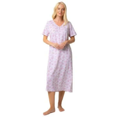 This nightdress made from a soft jersey fabric and available in many attractive designs. Made from 100% jersey cotton, the nightdress features a 3-button fastening in a V-neck style, and short sleeves. Length is between 46 and 47 inches, or 116 -120 cm. Machine washable. The ultimate in roomy comfort and available up to size 30/32. SUZY & ME - We are a small brand based in the Lancashire Hills, our focus is to provide our customers with warm and comfortable loungewear and sleepwear using quality fabrics and stylish, unique prints and designs. Check out our Suzy & Me storefront for our full range. AVAILABLE IN A WIDE RANGE OF SIZES: This women’s long nightgown is available in sizes ranging from 10 to 32, offering a comfortable and flattering fit for all body types. SOFT JERSEY FABRIC: Made from premium, soft, and breathable 100% cotton jersey fabric, this nightgown provides exceptional comfort, perfect for a restful night’s sleep. SHORT SLEEVES AND V-NECK: Featuring short sleeves and an elegant V-neckline with a 3-button closure for added convenience and a sophisticated touch. SHORT SLEEVES AND V-NECK: Featuring short sleeves and an elegant V-neckline with a 3-button closure for added convenience and a sophisticated touch.