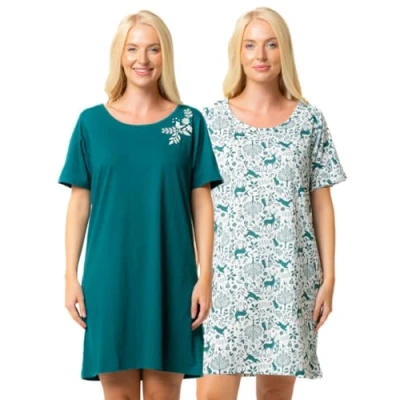 Suzy & Me Womens Pack of 2 Short Sleeved 100% Cotton Jersey Nightshirts. Butterfly, Heart, Stag, Bee, Campervan Print Designs (FOREST, 12 14)