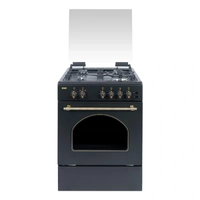 Butane gas ready cooker with 2 gas outlets and includes city gas conversion kit Black rustic aesthetic with glass flip top and manual control system with automatic ignition WOK 4 Burner Gas Hob with Triple Flame Burner Features mechanical control, black rustic countertop and enameled grills Gas oven with 59 liters capacity