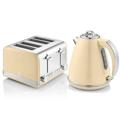 Add a touch of retro chic to your kitchen with the Swan Retro Cream Kettle & Toaster Set.Swan Retro Cream 1.5 Litre Jug Kettle -The durable stainless steel body houses a 3000W concealed heating element. The 360° rotating base with cord storage makes this jug kettle suitable for left or right handed use whilst a handy water gauge shows how much water is in the kettle. Other features include an automatic switch off function and overheat and boil dry protection.Swan 1.5 litre jug kettle dimensions: L 18.2cm x W 18cm x H 23.2cm.Swan Retro Cream 4 Slice Toaster -There are 6 levels of browning to choose from as well as cancel, reheat and defrost functions with red indicator lights. A high lift function makes removing smaller slices of toast easier. Other features include a removable crumb tray, cord storage and non-slip rubber feet.Swan 4 slice toaster dimensions: L 26.5cm x W 29.2cm x H 18.2cm.Part of the Swan Retro Collection - a classic range of appliances featuring the vintage retro designs and colours of the 50s, 60s and 70s.The Swan Retro Cream Kettle & Toaster Set is supplied with a 2 year manufacturer's guarantee.