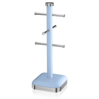 6 cups capacity, Made from durable stainless steel, Coated iron base and pole Swan Retro Cup holder 6 cups capacity Stainless steel Blue. Mounting type: Freestanding, Product colour: Blue, Material: Chrome, Iron, Stainless steel. Width: 150 mm, Depth: 150 mm, Height: 410 mm. Package width: 165 mm, Package depth: 165 mm, Package height: 435 mm Made from durable stainless steel and displaying up to 6 cups, this stylish mug tree keeps your countertops clean and tidy whilst also adding convenience. Its sturdy construction offers added durability whilst its chrome-plated branch stoppers add a touch of style into your kitchen.. The mug tree comes complete with a round, chrome-finish base with a soft underliner, which adds stability whilst also protecting your kitchen surfaces. Requiring a simple wipe clean, for easy maintenance, and available in a variety of colours, this 6 Cup Mug Tree makes for both a stylish and practical addition to your home Features Quantity per pack 1 pc(s) Material Chrome, Iron, Stainless steel Number of cups supported 6 Product colour Blue Mounting type Freestanding Packaging data Package type Box Package height 435 mm Package depth 165 mm Package width 165 mm Weight & dimensions Height 410 mm Depth 150 mm Width 150 mm