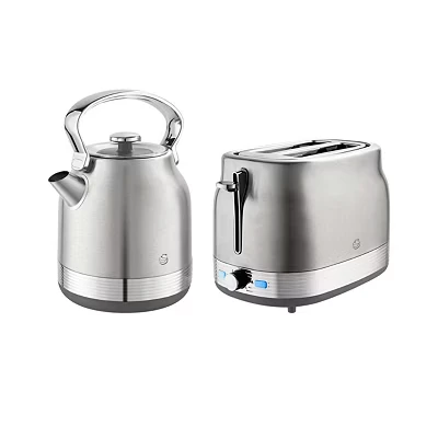 Swan Retro Kitchen Set, 1.7L Rapid Boil Traditional Kettle and 2 Slice Toaster, Non Slip Feet, Stainless Steel, SK14631SS & ST19028SS