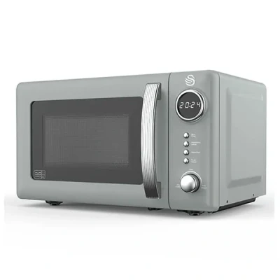 Harts of SturThe Retro Revive Grey Digital Microwave by Swan combines vintage charm with modern convenience, making it the perfect addition to any kitchen.With a powerful output, this microwave ensures fast and efficient cooking, heating, and defrosting.Its generous capacity easily accommodates a standard 10-inch dinner plate, providing ample space for family meals without taking up too much room on your countertop.Featuring five power levels and twelve auto-cook programs, it offers versatile options for everything from quick reheats to full meals. You can defrost by time or weight for added flexibility, while the digital display and 60-minute timer make operation simple and precise.The high-quality 270mm glass turntable ensures even cooking, and the pull-handle door includes a child lock function for safety. This this stylish microwave blends retro aesthetics with practical features, making everyday cooking effortless.Capacity: 20 litres. Power: 800W. Dimensions: 25.8(H) x 45.1(W) x 32.5(D)cm.