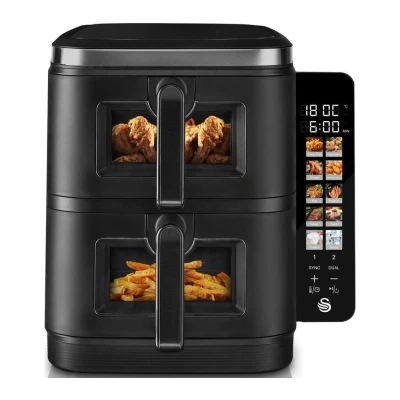 CurrysWhy wait ages for dinner? This Swan dual air fryer, with its two 5.5 litre baskets, lets you cook different dishes at once. Think roast veggies in one, crispy fish fingers in the other. And thanks to its cyclone technology, you can enjoy your favourite treats using little to no oil. Plus, with 10 presets like fries, steak, and bacon, you can rustle up a variety of dishes at the touch of a button. Good to know - The Sync function means they'll be ready together - no more burnt chips waiting for the chicken to be done - Steak, veggies or sides of your choice - prep up to 4 foods in one go - Its foldable touchscreen makes it super easy to choose programs and temperatures - No more guesswork - with its viewing window you can check if the steak is cooked to perfection - It has two stackable drawers so no more fighting for space