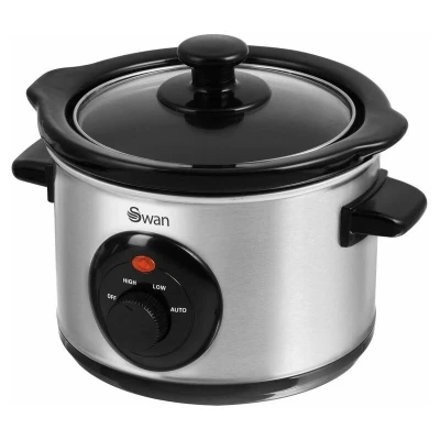 JoybuyThe Swan 1.5L Slow Cooker (SF17010N) is a compact, stainless steel cooker with three heat settings, removable ceramic pot, and a glass lid, ideal for small households. It offers hassle-free slow cooking, a keep warm function, easy cleaning, and comes with a 32-page recipe book.