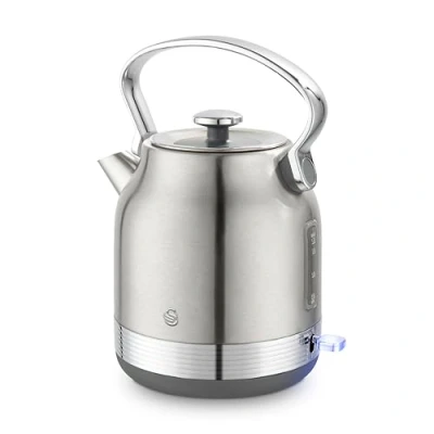 The Swan Retro Revive Traditional Kettle Stainless Steel brings classic charm and modern functionality to your kitchen. Designed in the style of an old-fashioned stovetop kettle, this electric kettle combines vintage aesthetics with advanced features for everyday convenience.Its powerful rapid boil technology heats one cup of water in under 45 seconds, while the generous capacity provides up to seven cups from a single fill, perfect for family use or entertaining guests.Crafted from painted stainless steel with elegant chrome accents, it offers durability and style in equal measure. The kettle includes a manual pull-top lid and a concealed heating element for a sleek finish, along with a 360 degree rotating base that makes it easy for both left and right-handed users to pour safely.A built-in water indicator window allows you to measure the exact amount you need at a glance, and the removable limescale filter ensures a clean, fresh taste every time.For added convenience, the blue illuminated on/off switch automatically shuts off after boiling, while hidden cord storage keeps your countertop neat and tidy.Capacity: 1.7 litres. Power: 3KW. Dimensions: 27.6(H) x 23.6(W) x 18.4(D)cm. 75cm cord length.