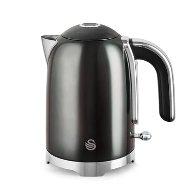 Harts of SturThe Swan Solace 1.7L Stainless Steel Jug Graphite Kettle is the perfect blend of elegance and performance, designed to elevate your kitchen with its premium high-gloss finish and contemporary style. Crafted from durable stainless steel with a sleek chrome trim, this kettle offers both sophistication and practicality.Its powerful rapid boil technology ensures quick heating, while the generous capacity provides up to seven cups from a single fill, ideal for family use or entertaining guests. The push-top lid and transparent water gauge make filling and measuring effortless, and the 360-degree rotational base allows easy handling for both left and right-handed users.Safety features include boil-dry protection and an automatic shut-off function, while the blue illuminated on/off switch adds a modern touch.Hidden cord storage keeps your countertop neat, this kettle combines style, convenience, and reliability.Capacity: 1.7 litres. Power: 3KW. Dimensions: 24.4(H) x 23.5(W) x 15.(D)cm. 70cm cord length.