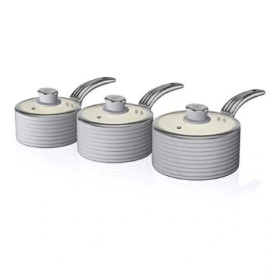3 peice saucepan set 16cm - 18cm - 20cm with a Body height of 8cm - 9cm - 10cm 3mm Thick Pressed Aluminium Glass Lids With Chunky Stylish Softtouch Swan Knob And A Beautifully Rib Designed Body Ivory Ceramic Non-Stick Inner Coating, Heat Resistant Exterior Colour Coating, Bakelite Softtouch Stay Cool Handle Suitable For All Hobs Including Induction
