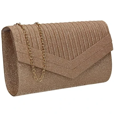 LOOK FAB - Gorgeous Sparkly Clutch which looks Simple & Elegant and is easy to match with your perfect outfit. INFO - Size: 24 x 14 x 6 cm Approx, measured from largest points, MATERIAL: Synthetic, Gold Chain Strap Included. TYPE: Envelope Shape Clutch Bag. CLOSURE: Magnetic Snap Button STYLE - This Clutch is a perfect elegant accessory for your formal occasions. Match the bag with shoes or fascinators for that polished look. The flap has a magnetic button snap which just clicks shut. The Clutch is perfect size for Smartphone, Cards, Lipsticks and essentials. OCCASIONS - Perfect Bag for Prom or Weddings & ideal to match with Bridesmaid's outfits. These clutches will go beautifully with Glam days out such as the Races & Garden Parties. Can hold as a Clutch Bag / Purse or wear on the shoulder with the removable chain strap. GUARANTEED - We love these Clutches and we are sure you will too. However if for any reason you don't, just send it back our way for a full refund. Buy with confidence, SWANKYSWANS is a trusted British Brand.