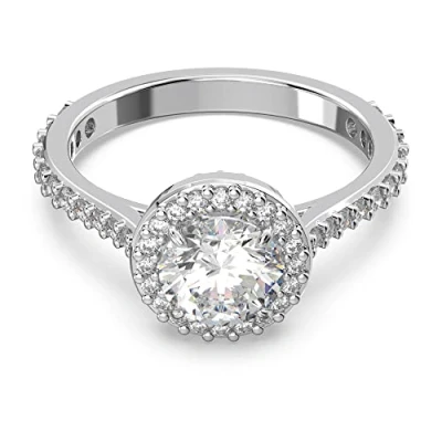 Measurements: Size 58 Stunningly timeless: Wear this exquisite ring to bring glitter and glamour to any outfit with a lustrous brilliant cut crystal framed by pave stones in a rhodium plated setting Crafted with excellence: Swarovski's glass cutting mastery sets tiny crystals around a glistening star-like centrepiece using our signature pave technique, set in an elegant, comfortably fitting band Enhance your outfit: Layer with other pieces from the Constella collection for the full Swarovski statement look, or wear on their own for a glamorous and sparkling addition to your outfit Designed to last: Swarovski jewellery features the extraordinary brilliance of Swarovski crystals and durable metals; to ensure the life of your jewellery avoid contact with water, lotions or perfume Items delivered: 1x Swarovski Constella cocktail ring, white crystals in a rhodium plated setting, with a Swarovski ring box