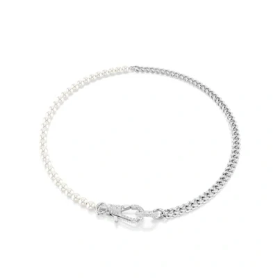 This rhodium plated necklace strikes the perfect balance between industrial chic and modern elegance Its bold design combines a classic Dextera chain with a string of white Swarovski Crystal Pearls, united in the centre with a distinctive lobster closure encrusted with a pavé of clear crystals A powerfully elegant everyday piece