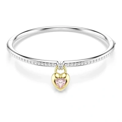 A luxurious statement of romance, this slender bangle is paved in clear crystals and features a locket-inspired heart at the center The romantic motif features a pink Swarovski Zirconia in gold-tone plating on one side, and clear crystal pavé in rhodium plating on the other side Wear it with the matching ring to maximize the look of love