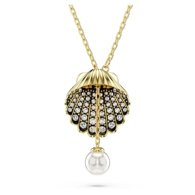 Capturing the serenity and beauty of the ocean, this Idyllia pendant will bring a touch of marine inspiration to your style The gold-tone plated piece is worn on a delicate necklace and features a shell motif at the centre This has been artistically adorned with clear round crystals placed within a black setting, while a single Crystal Pearl sits inside For extra versatility, the pearl can be pulled out of the shell, adjusting the style into a Y-shape design