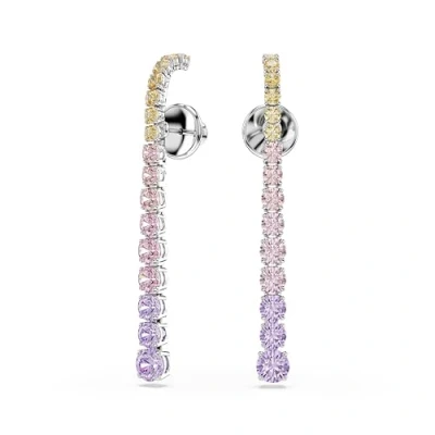 These Matrix tennis earrings give classic elegance an injection of pastel color Each rhodium plated piece displays a glowing strand of crystals, presented in a gradient of round cut sizes in pink, purple, and yellow shades To maximize the style effect, these dangling earrings can be paired with the matching necklace or bracelet