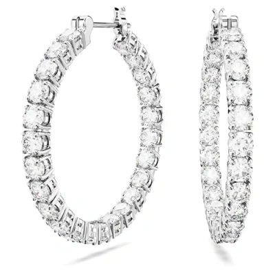 ArgentoElevate your look with these dazzling hoop earrings from Swarovski. Crafted with a rhodium plating, these illuminating hoops feature round cut white Swarovski crystals to the inside and exterior of the hoop earrings - meaning youll sparkle from all angles! perfect for adding a shimmering, stylish finish to any look. Rhodium plating Hoop earrings Dimensions: 30x28mm White crystal details
