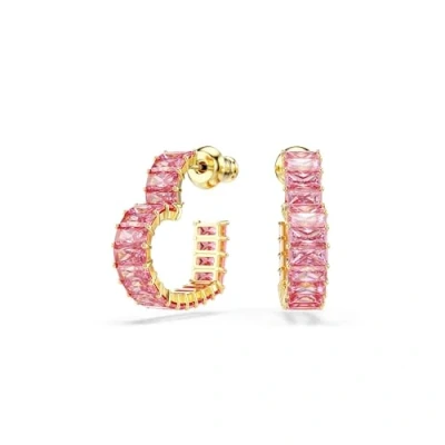 Swarovski Matrix hoop earrings, Baguette cut, Heart, Small, Pink, Gold tone plated