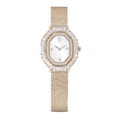 Case Size: 30 x 25 mm; Band Length: 12.5 - 19 cm; Mechanism: Quartz; Clasp Type: Fold-Over Timeless Design: Experience the pinnacle of Swarovski's watchmaking excellence with this elegant stainless steel timepiece, featuring an octagon-shaped case in a gleaming champagne gold-tone finish Shimmering Style: Boasting 78 clear round and fancy-cut crystals on the bezel, three crystal indexes on the sunray dial and a single crystal in the crown, this wristwatch sparkles in a way that only Swarovski pieces can Exquisite Durability: This radiant watch is water resistant to 50 m and rests on an adjustable mesh bracelet strap, making it a fashionable accessory for any occasion Designed to Last: Swarovski watches maintain their brilliance when simple care practices are observed; remove before contact with water, lotions or perfumes and polish with a lint-free cloth Items Delivered: 1 x Swarovski Matrix octagon watch with mesh bracelet strap in a champagne gold-tone finish; 1 x Swarovski watch box
