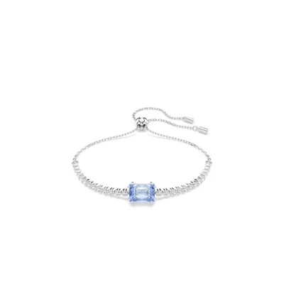 Maximum Length: 24 cm; Motif Size: 0.5 x 0.9 cm; Clasp Type: Sliding Ball Bold Design: Shine brightly with this stunning tennis bracelet, featuring a blue baguette-cut stone at the centre complete with a gleaming rhodium finish Luxurious Style: Wear this brilliant tennis bracelet on its own or pair it with other iconic pieces of jewellery from the Swarovski Matrix collection for a glamorous look that will steal the spotlight Designed to Last: Swarovski jewellery maintains its brilliance when simple care practices are observed; remove before contact with water, lotions or perfumes and polish with a lint-free cloth Items Delivered: 1 x Swarovski Matrix tennis bracelet with clear round-cut crystals and blue baguette-cut centre stone in a rhodium-finished setting; 1 x Swarovski necklace box