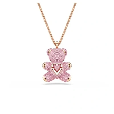 Inspire a smile with this playful pendant. The 3D teddy is covered in light pink crystal Pointiage and holds a heart-shaped 'dancing' stone in a vibrant pink shade. Finished with a rose gold-tone plated chain, this unique design encapsulates luck and love.