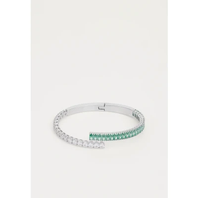 Update your elegant stacks with this stunning Swarovski bangle. Crafted with rhodium plating, this stunning bangle features a crossover design, with white circular crystals, green baguette crystals, and hinged fastening. Style this bangle with a matching Swarovski necklace for extra sparkle. Rhodium Plated White and green cubic zirconia crystals Circular and baton shaped crystals Crossover style Hinged fastening Length: 16.7cm Width: 1.2 cm