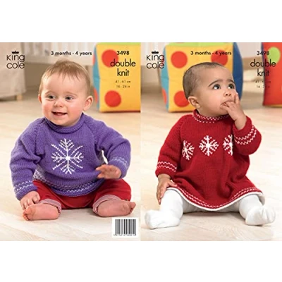 King Cole 3498 Pattern The pattern gives you measurements to create the garments for babies from 3 months up to 4 years: 16" - 24" (41cm - 61cm) chest approximately. This King Cole knitting pattern is suitable for use with most double knit yarns however, tensions may vary and we recommend you knit a tension square before knitting the whole garment. See image provided for the number of 100g balls of wool required for each garment. The wool illustrated is King Cole Comfort DK. Please note that this is a knitting pattern and NOT a set of finished knitted garments. All knitting instructions are written in English.