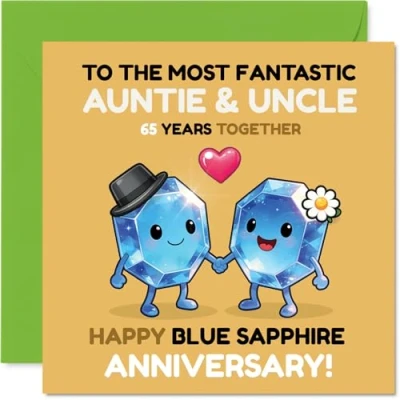 Brimming with joy. this card features two adorable gemstone characters happily marking 65 sparkling years together. sure to make anyone feel extra cherished The lively blue. yellow, and green palette. paired with a cute sapphire motif. creates a vibrant design that stands out amongst anniversary greetings Printed on quality gloss single sided board with an uncoated inside for smooth writing. No smudging when writing inside - your heartfelt words stay crisp Inside message: Auntie & Uncle. Comes complete with a matching envelope for that perfect finishing touch. The 145mm Square format is convenient to display or post Expertly crafted in the UK using FSC-certified and recyclable materials, so you can send your love with added peace of mind. Printed in the UK