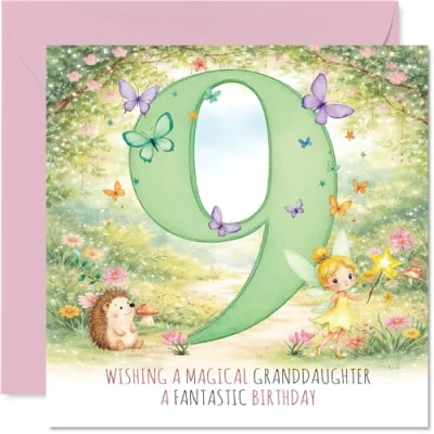 Captures a magical birthday moment with a fairy and fluttering butterflies, perfect for celebrating all the wonder of turning 9. Birthday card for Granddaughter with a light-hearted design style Charming design showcases a large green number 9, surrounded by pastel pinks and soft nature details that pop with gentle whimsy. Recyclable and printed in UK for a considerate choice Printed on quality gloss single sided board with an uncoated inside-no smudging when writing inside. Proudly made in the UK and fully recyclable Blank inside so you can add your own heartfelt birthday wishes. Envelope included for that perfect finishing touch. The 145mm Square format is convenient to display or post Created with attention to detail for a card that's sure to bring smiles and be treasured long after the candles are blown out. Printed in the UK