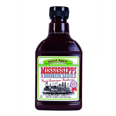 Mississippi Barbecue Sauce - Sweet Apple Flavour. The Mississippi sweet apple is an authentic BBQ sauce with a twist, made in mid-west USA. Sweet, with body, not a heavy smoke. Perfect for use as a condiment, marinade or to add a smoky BBQ flavour to any dish. These sauces are tomato based - so natural base to work from and only 1 E-number which is a natural caramel. And kosher approved!