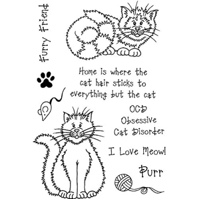 AmazonHome is where the cat hair is. A6 polymer Clear stamp set Stamps have a naturally sticky back Simple to align use and re-use Stamps do not yellow Set includes cute cats a mouse A paw ball of wool cat sentiments