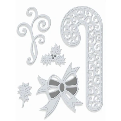 Prettily designed swirly candy cane with ribbon and bow and holly sprigs embellishments die cutting and embossing die Suitable for Scrapbooking, Journaling, Card Making and paper crafting Compatible with most leading die cutting machines Designed by Sue Dix Set comprises of 5 dies