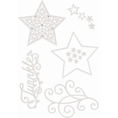 Filigree Stars. Christmas die set including a filigree star with embellishments. This dies cuts, embosses and scores. Fits almost all of the leading die cutting machines. Set includes an ornate star, star frame, swirls, mini star collections. Sentiment: Twinkles. Width of star is circa 81mm. 6 pieces of metal but this set actually produces 16 die cuts. SDD602