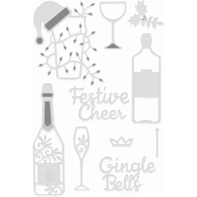 Gin-gle Bells. Christmas die set including seasonal sentiments, pint glass, wine glass, champagne glass, gin bottle, wine or champagne bottle, mixing stick, crown and holly. This dies cuts, embosses and scores. Fits almost all of the leading die cutting machines. Create some fun cards with season cheer in mind. Sentiments: Festive Cheer; Gingle Bells. Width of pint glass is circa 68mm edge to edge. SDD606