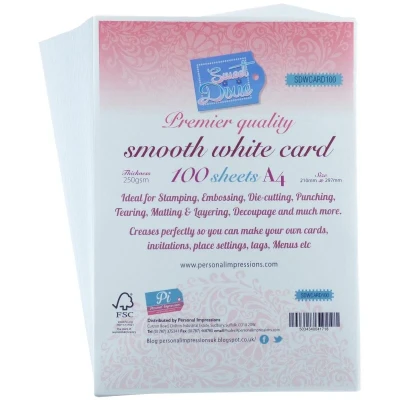 Premier Quality Smooth White Card thickness 250gsm - 100 sheets A4.. Ideal for Stamping, Embossing, Die-Cutting, Punching, Tearing, Matting & Layering and Decoupage. Creases perfectly so you can make your own Cards Invitations, Place Settings, Tags etc.. Acid Free and complies with ISO standard ISO9706.