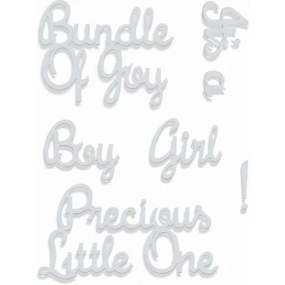 Bundle of joy baby sentiments die cutting and embossing die Suitable for scrapbooking, journaling, card making and paper crafting Compatible with most leading die cutting machines Designed by Sue dix Set includes Bundle of Joy It's a Girl Boy Precious Little One and exclamation mark